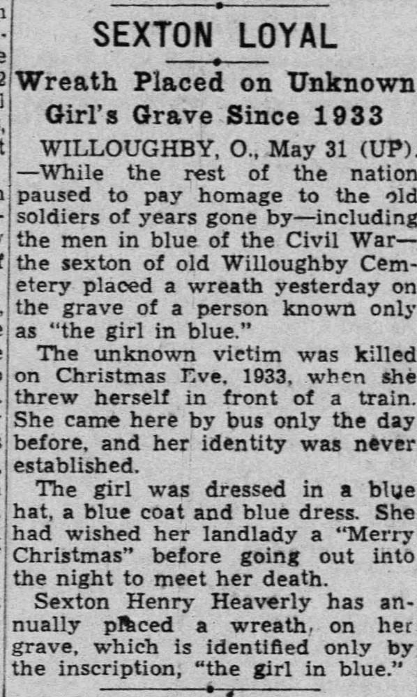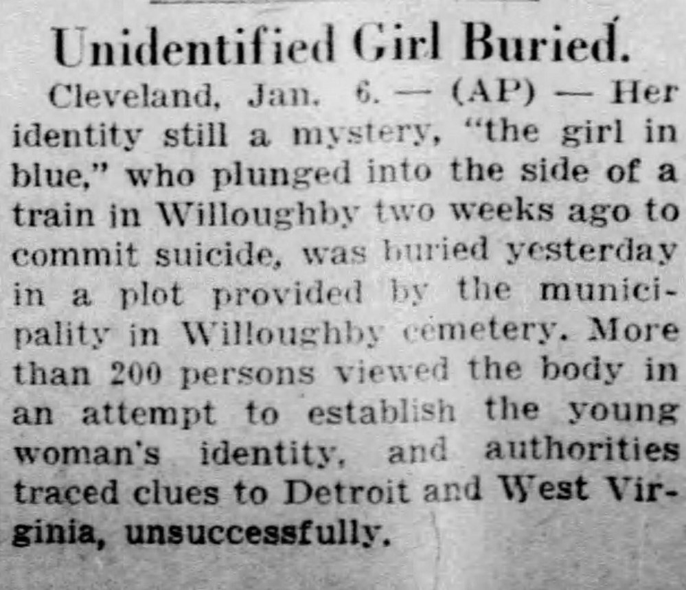 Willoughby residents raised $60 for a headstone, and the Girl in Blue was laid to rest in Willoughby Cemetery in a plot donated by a resident. An additional $15 was placed in a city fund to ensure geraniums would be placed on the grave once a year.