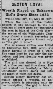 Henry “Hank” Heaverly, the sexton, took it upon himself to raise donations for a memorial. In 1936, he was still trying to get the $30 needed, after E. D. Rich & Sons agreed to sell the stone at cost. Eventually, he raised some money and contributed some of his own. He would place a wreath on her grave every year.